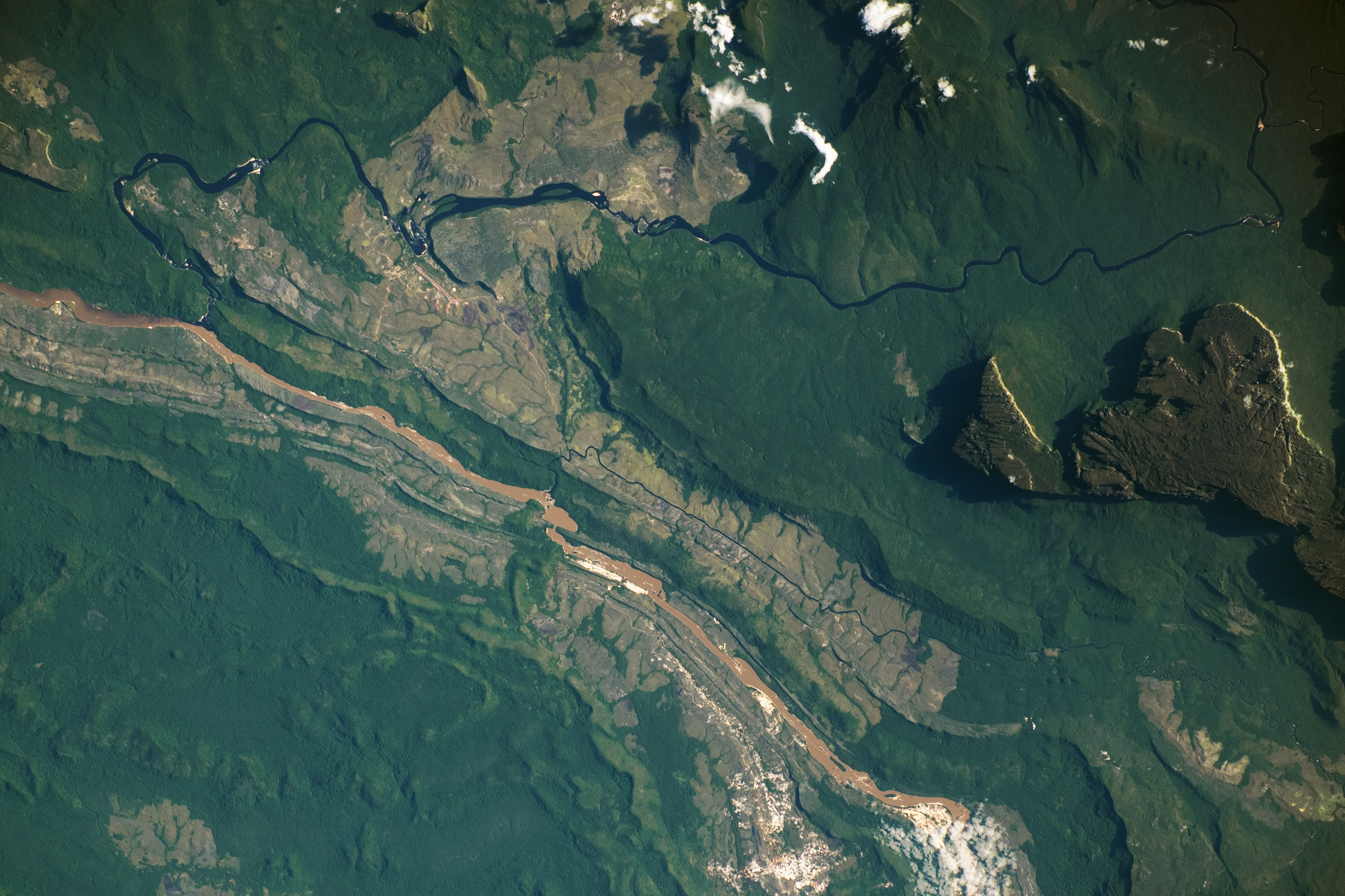 This photograph, taken by an astronaut aboard the International Space Station, captures the lush, dynamic landscape of southeastern Venezuela. The Auyán-tepuí, also called Auyán Massif, towers thousands of feet above the surrounding area, casting shadows along its northern and western edges. The Caroní and Carrao rivers flow west of the massif, converging near Canaima and ultimately joining the Orinoco River.